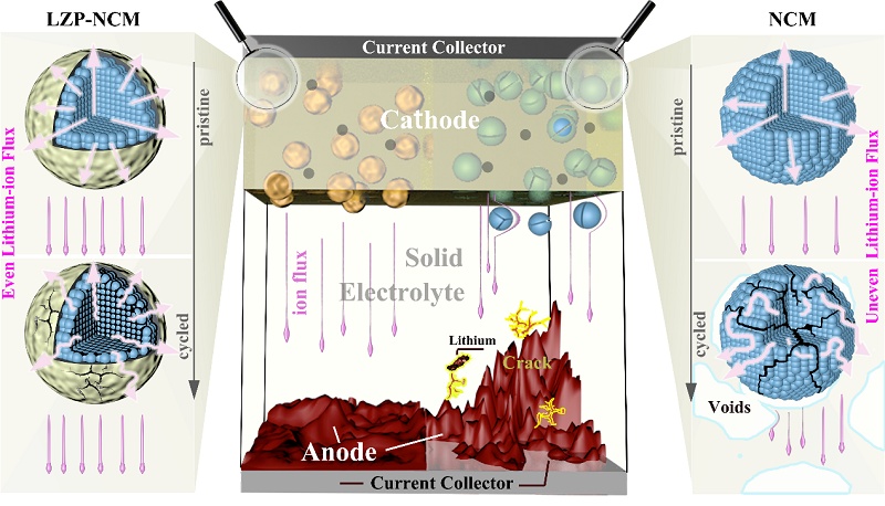 為解決上述問題,固態能源系統技術中心采用先進高分辨無損三維同步輻射X射線斷層掃描成像技術(SXCT),對LiNi0.8Co0.1Mn0.1O2(NCM)|Li6PS5Cl|Li固態電池衰退機制進行了深入研究。實驗結果表明因正極電化學-機械力學耦合失效誘導的反應異質性產生不均勻的鋰離子通量并傳輸到負極,進而產生不均勻的鋰沉積、溶解行為及死鋰的產生等。鋰負極不均勻的電化學反應行為又反作用于正極并強化其反應異質性,形成一種正負極衰退互相促進的正強化機制。隨著電池繼續循環,正負極不均勻反應加劇造成結構破壞,同時正負極體積縮脹引起電解質的塑性變形,最終致使電池失效。對比實驗表明采用LiZr2(PO4)3(LZP)對正極進行改性,不僅有效抑制了正極的電化學-機械力學耦合失效,而且顯著提高了負極鋰沉積-溶解均勻性和電解質的結構完整性。該項工作揭示了硫化物基全固態電池中由鋰離子傳輸動力學的動態演變引起的正負極之間正強化的衰退機制,首次提出了全固態金屬鋰電池正負極相互信賴、相互關聯的失效行為,為進一步優化和發展全固態電池提供了新的思路和指導方向,為開發下一代高能量密度與高安全性的高鎳三元硫化物基全固態電池奠定了研究基礎。