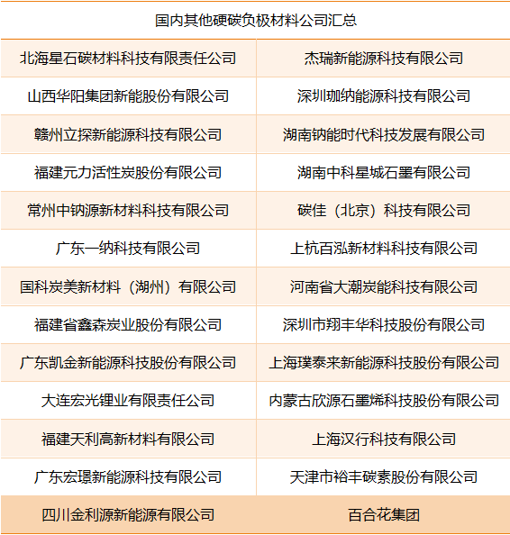 我國硬碳負極材料廠商主要有:
