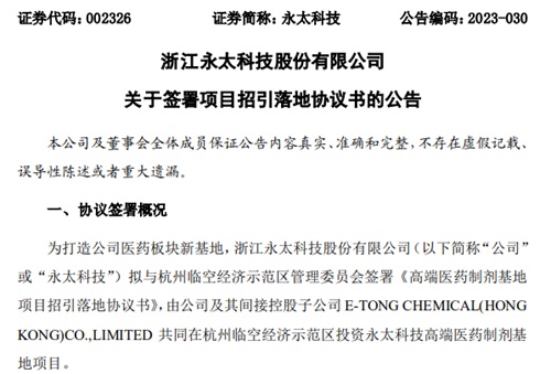 中國粉體網訊 5月4日晚間公告,為打造公司醫藥板塊新基地,浙江永太科技股份有限公司(“公司”或“永太科技”)擬與杭州臨空經濟示范區管理委員會簽署《高端醫藥制劑基地項目招引落地協議書》,由公司及其間接控股子公司E-TONG CHEMICAL(HONG KONG)CO.,LIMITED共同在杭州臨空經濟示范區投資永太科技高端醫藥制劑基地項目。