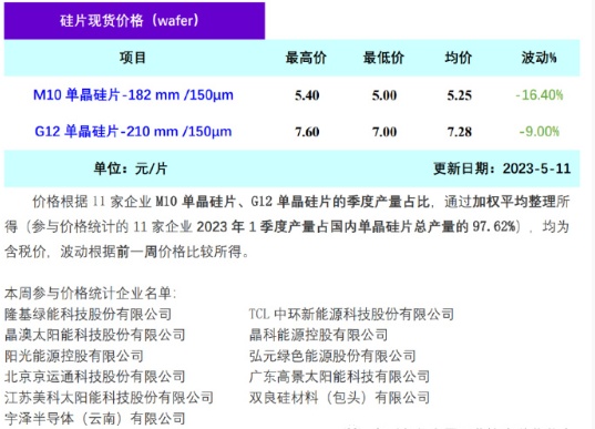 中國(guó)粉體網(wǎng)訊 5月11日,TCL中環(huán)公布最新單晶硅片價(jià)格,部分品種較前期降價(jià)超15%。其中,218.2、210、182尺寸的150μm厚度P型硅片價(jià)格分別為6.91元/片,6.4元/片,5元/片;210、182尺寸的130μm厚度N型硅片價(jià)格分別為6.52元/片,5.09元/片;210、182尺寸的110μm厚度N型硅片價(jià)格分別為6.26元/片,4.89元/片。