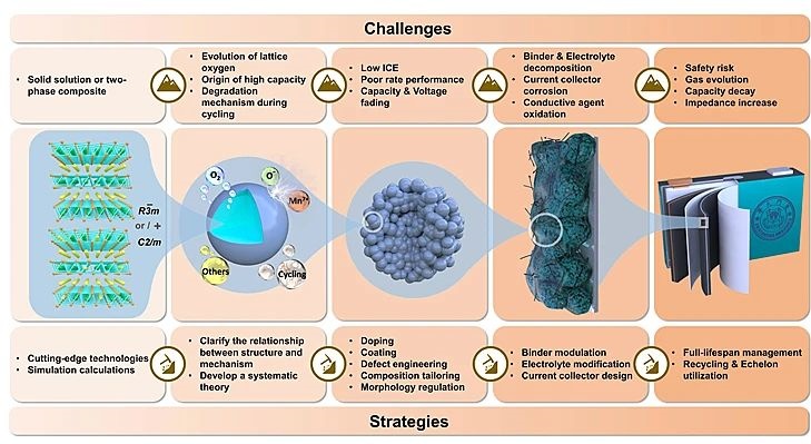 圖1. 富鋰正極材料從晶體結構到實際應用各個階段面臨的挑戰(zhàn)和策略概述