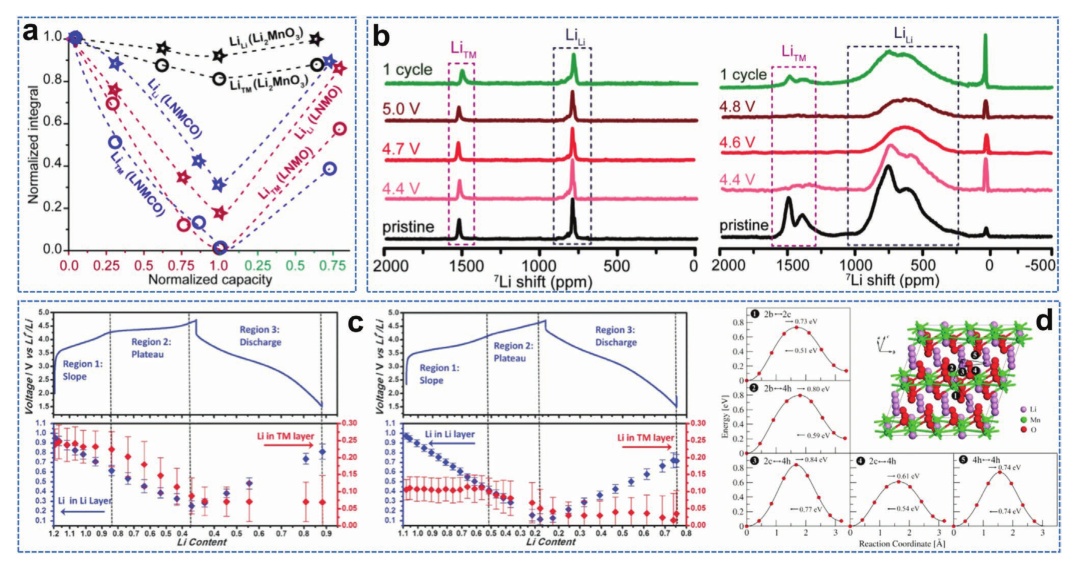 圖6. a)循環(huán)電極的7Li核磁共振信號積分比較;b) Li2MnO3(左)和LNMCO(右)電極的7Li各向同性NMR譜;c)Li(Lix/3Ni(3/8−3x/8)Co(1/4−x/4)Mn(3/8+7x/24)O2(HLR,左)和Li(Lix/3Ni(1/3−x/3)Co(1/3−x/3)Mn(1/3+x/3)O2 (LLR,右)在不同的鋰離子溶出/鋰化狀態(tài)下的電化學充放電曲線;d)利用FPMD模擬,用輕推彈性帶(NEB)方法計算從Li原子軌跡中檢測到的5個典型的鋰位點之間的移動能壘。