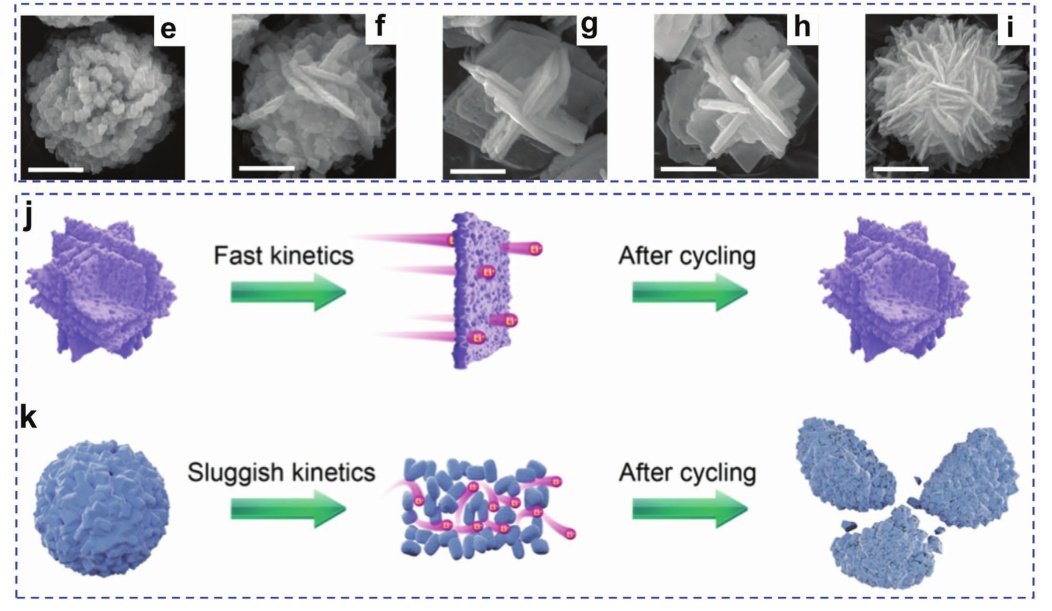 圖11. a)層狀鋰金屬氧化物正極的晶體結構,b)(010)平面,c)(100)平面,d)(001)平面;e-i) 富鋰基碳酸鹽前驅(qū)體的SEM圖像;j)不同的鋰在三維立方體正極和k)常見的0D類微球正極中的擴散動力學;l) Ni1/3Co1/3Mn1/3(OH)2晶體的各向異性生長過程。