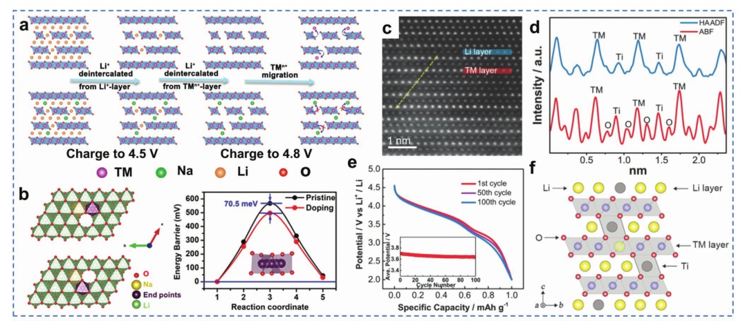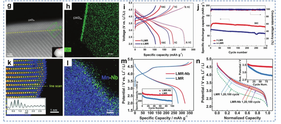 圖12.a) 富鋰正極材料的結構演化示意圖;b) Na+摻雜富鋰錳基正極材料的計算模型和結果;制備的LT-LRM的結構:c) HAADF圖像和d)沿(c)中標記的虛線的Ti、TM和O的相應線掃描剖面;e)一些選定的LT-LRM的標準化放電電位剖面;f) Li-Ti混合結構示意圖;g)沿[010]區(qū)軸投影的f-LRM(202)面附近的體到表面區(qū)域的原子尺度z對比度圖像;h)電化學循環(huán)下f-LRM粒子中Zr4+的STEM-EDS映射;i) f-和s-LRM的充放電電壓分布;j) f-和s-LRM的循環(huán)穩(wěn)定性;k) LRM-Nb樣品近表面的HAADF圖像;l) Mn和Nb對應的EDS映射;m)初始周期剖面;n)一些選定的標準化放電剖面。