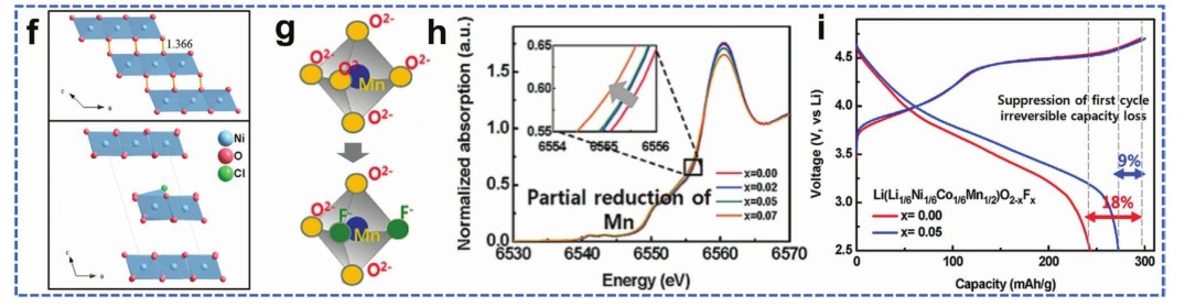 圖13.a)表層結構誘導過渡示意圖;b) BO4優(yōu)化后的Bx-LRM晶體結構示意圖;c)當x=0和0.02時,Bx-LRM的循環(huán)性能;d-e)當d)x=0和e)x=0.02時Bx-LRM的電壓變化;f) NiO3(上)和NiO2.875Cl0.125(下)溶解態(tài)的結構響應;g) F摻雜LRM的優(yōu)化晶體結構示意圖;h)XANES光譜;i) Li[Li1/6Ni1/6Co1/6Mn1/2]O2−xFx的初始充放電曲線(x=0.00,0.05)。