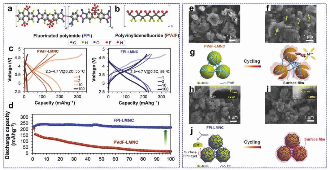 圖18.a)氟化聚酰亞胺(FPI)球棍型和b)聚偏氟乙烯(PVDF)粘合劑;c) PVDF-LRM//石墨(左)和FPI-LRM//石墨全電池(右)的充放電電壓分布,以及它們的d)循環(huán)性能;PVDF-LRM正極e)和f)100次循環(huán)前后的粒子形態(tài),F(xiàn)PI-LRM正極;h)和i)100次循環(huán)前后的粒子形態(tài),g, j)分別為其粒子形態(tài)和表面狀態(tài)變化示意圖;k)原始富鋰正極和l)1,3,6-己二腈(HTN)添加劑在正極電解質(zhì)上的表面改性機理的示意圖;m)在ED和含HTN的電解液中循環(huán)LRM/Li細胞的循環(huán)性能。