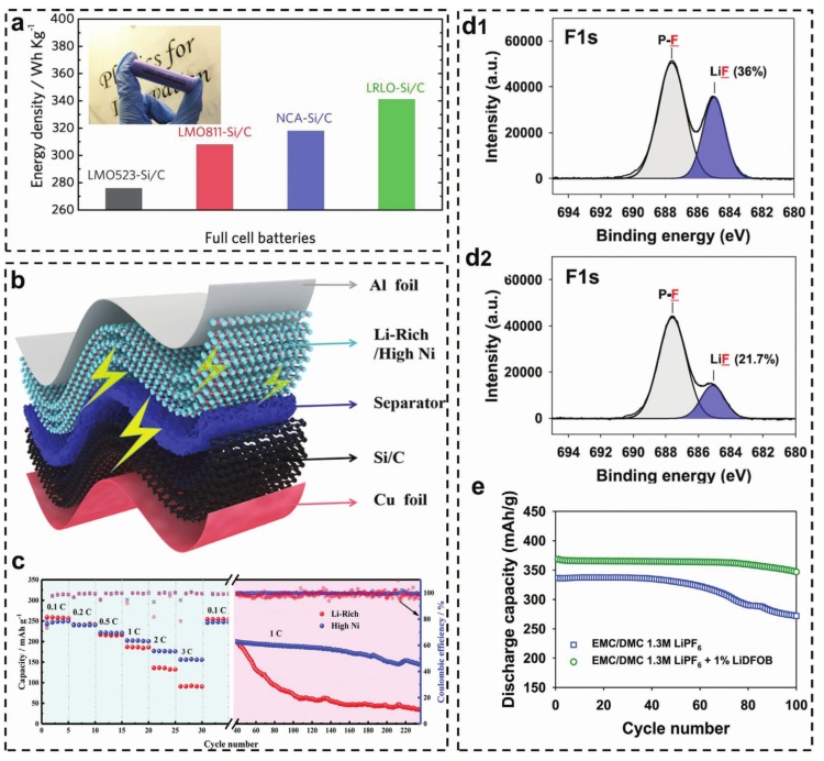 圖20.a)18650正極材料電池的能量密度;b,c)富鋰LRM/Si/C全電池制造示意圖及其速率容量。d1)不添加LiDFOB預循環(huán)后富鋰正極的F 1s XPS譜;d2)添加LiDFOB后富鋰正極的F 1s XPS譜;e)無電解液,含/不含1%的LiDFOB放電容量保持在C/2超過100次的循環(huán)曲線。