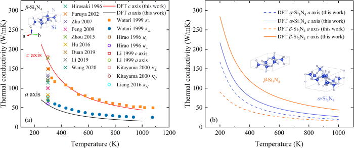 不過近日,猶他大學Tianli Feng教授團隊提出,之前關于Si3N4理論上限的預測值本身并不正確。通過第一性原理,該團隊揭示:室溫下β-Si3N4的理論熱導率上限沿c和a軸分別只有169W/mK和57W/mK,并不是之前認為的450W/mK。此預測不需要依靠擬合參數或經驗勢函數,因此普遍比較準確。通過預測值與多組實驗數據在較寬溫度范圍內的比較,研究者發現之前的實驗中已經達到理論熱導率上限,因此,實驗上繼續提高純度和顆粒大小并不會提高熱導率。作為對照,文中還計算了α-Si3N4,其熱導率沿c和a軸分別為116W/mK和87W/mK。