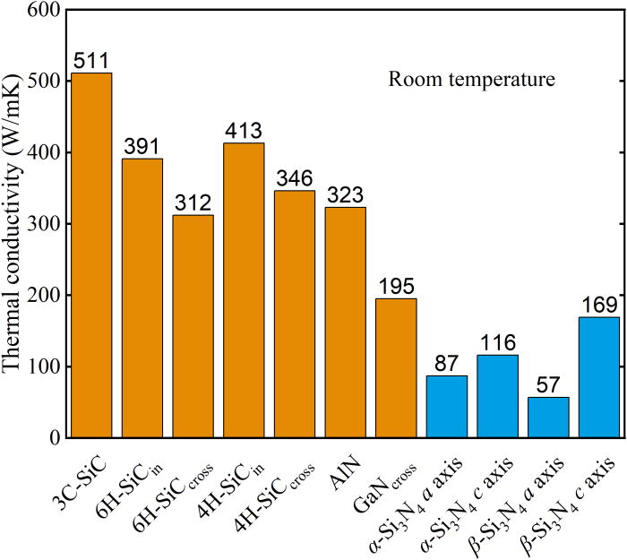 室溫下Si3N4熱導率與3C-SiC、6H-SiC、4H-SiC、AlN和GaN的對比。AlN和GaN的各向異性并不顯著,未展示在圖中。(來源:Theoretical upper limits of the thermal conductivity of Si3N4)