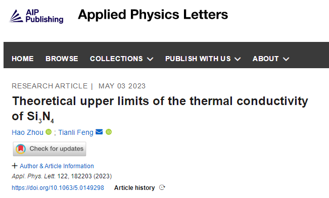 2、Hao Zhou、Tianli Feng,《Theoretical upper limits of the thermal conductivity of Si3N4》