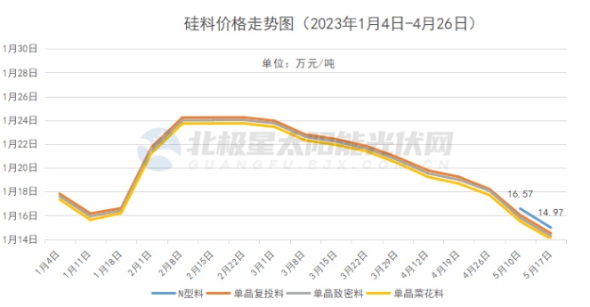 其中,國內(nèi)N型料價格區(qū)間在14.5-15.2萬元/噸,成交均價為14.97萬元/噸,周環(huán)比降幅為9.66%;單晶致密料價格區(qū)間在13.3-14.5萬元/噸,成交均價為14.27萬元/噸,周環(huán)比降幅為9.63%。