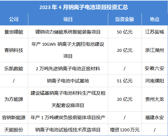 小編整理了4月開工或簽約的鈉離子電池項目。除上述鈉電項目外,4月中科海鈉完成B輪融資,國科炭美完成數千萬種子輪融資,鵬輝能源、海四達、眾鈉能源等企業也推出了鈉離子電池新品。