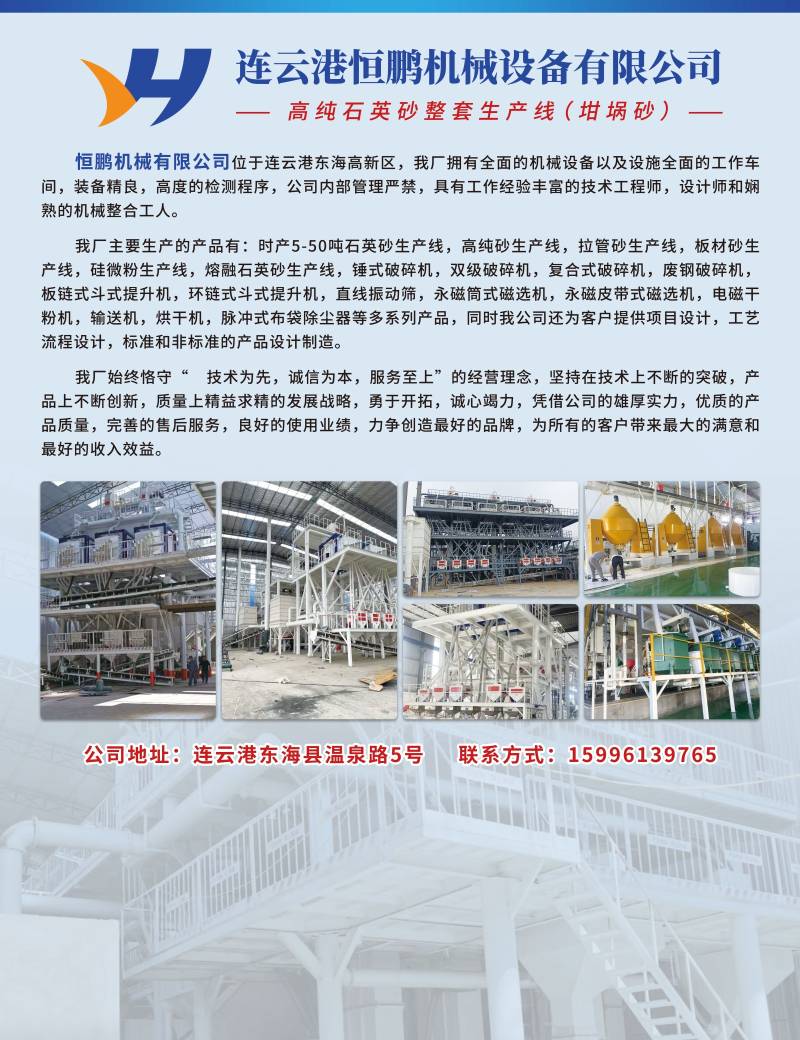 連云港恒鵬機械設備有限公司堅持高性價比、高合格率、高使用壽命產品路線,專業提供石英板材砂產線(4-120目),石英玻璃砂產線(40-160目),石英高純砂產線(80-200目),破碎、制砂、烘干、篩分、磁選、提升、除塵等設備及刀具等耗材配件。