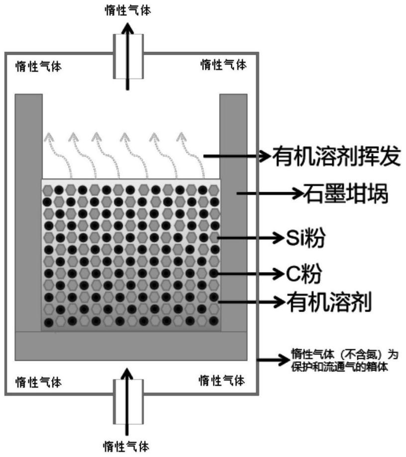 (5)向反應室中通入惰性氣體,維持反應室的壓力,逐漸升高反應室的溫度,使碳原料和硅原料發生反應,逐漸降溫至室溫,結束反應;