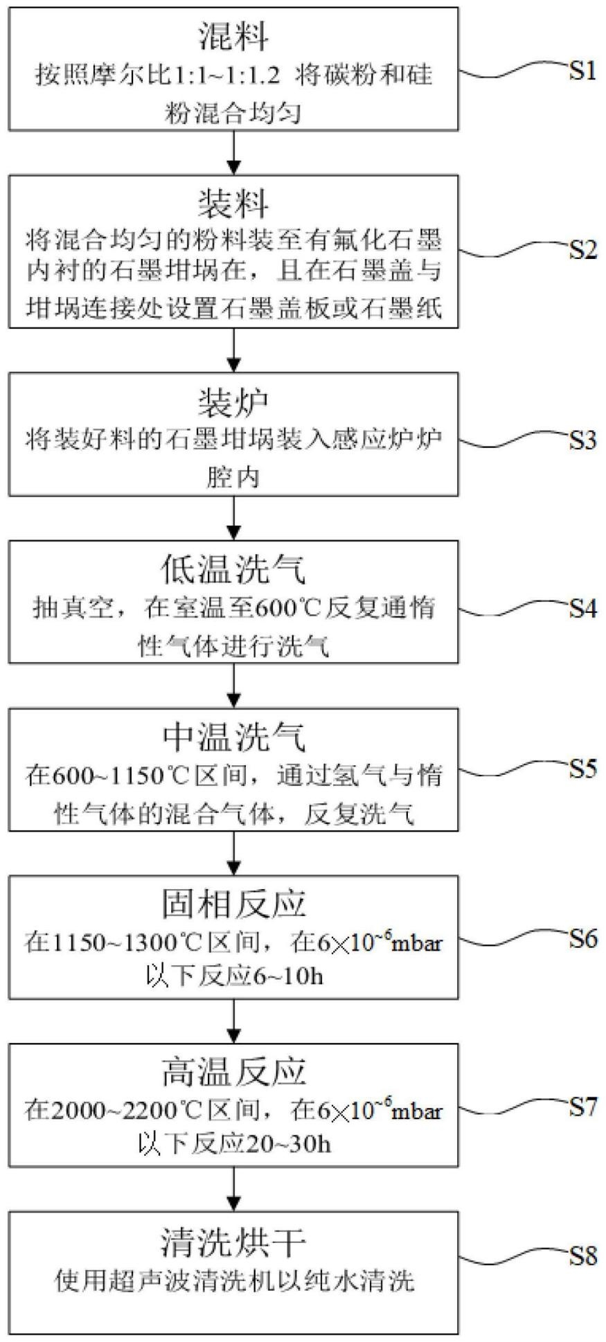 (2)在硅原料和碳原料混合物中加入除氮物質,之后將含有除氮物質和碳硅混合物原料的坩堝置于反應室中;所述坩堝材料為高純石墨,純度為99.9995%以上;