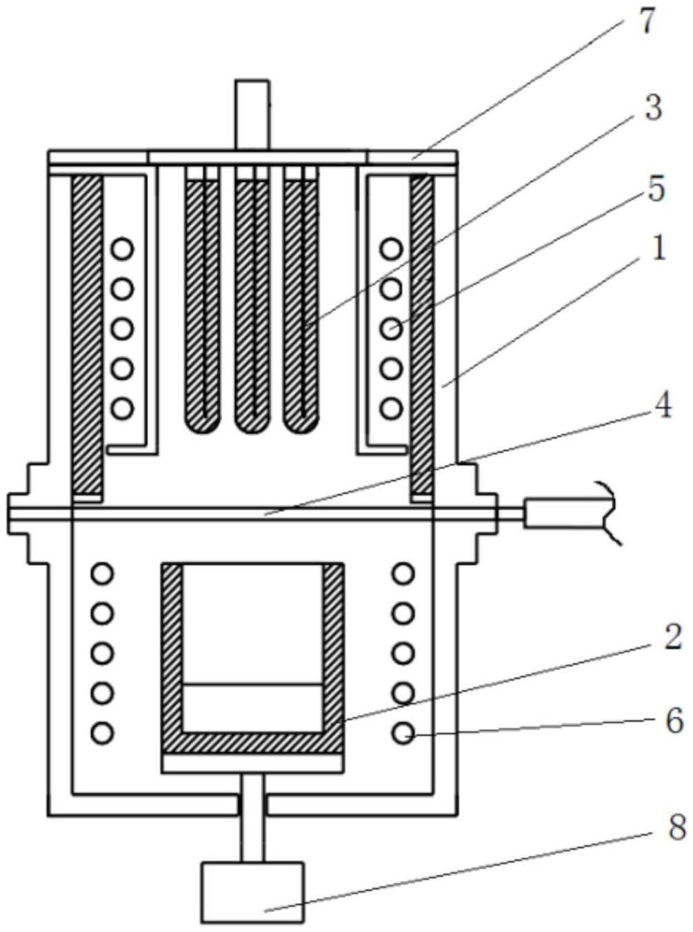 制備碳化硅粉裝置的結構示意圖;其中,1、爐體;2、坩堝;3、電極;4、隔板;5、第一加熱裝置;6、第二加熱裝置;7、爐蓋;8、升降裝置。