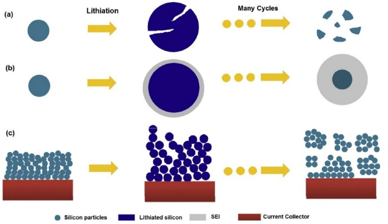 硅基材料的失效機制如圖1所示,主要包括如下三種因素:①循環(huán)過程中的體積變化會導(dǎo)致硅表面產(chǎn)生裂紋甚至粉化,材料之間失去電接觸會造成容量衰減;②循環(huán)過程中的體積變化會導(dǎo)致SEI膜的破碎和重組,SEI膜的持續(xù)增長會導(dǎo)致電池中有限的活性鋰損失,進而導(dǎo)致電池失效;③體積變化可能導(dǎo)致電極與集流體失去電接觸,從電極上脫落的活性物質(zhì)不能參與后續(xù)的循環(huán)過程,也會導(dǎo)致容量衰減。
