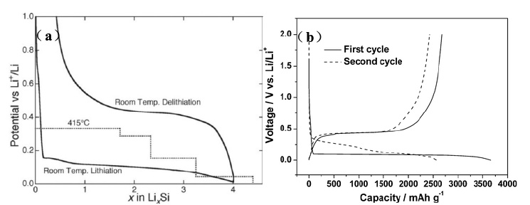 (a)硅在室溫和高溫下的鋰化曲線;(b)硅電極的前兩次充放電曲線