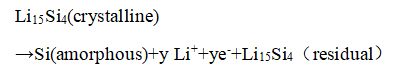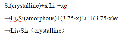 目前,對于硅的鋰化機理及失效機制已經(jīng)通過各種先進的表征手段有了一定的認(rèn)識,這對于硅的材料設(shè)計具有著重要的指導(dǎo)意義。在高溫條件時,鋰和硅的合金反應(yīng)遵循Li-Si二元平衡相圖,如圖2(a)所示,在鋰化過程中形成如Li12Si7、Li7Si3、Li13Si4、Li22Si5等金屬間化合物,在兩相區(qū)域會有不同的電壓平臺出現(xiàn),因此硅基材料最高的理論儲容量為4200mAh/g(Li22Si5)。但是,室溫下僅能形成LisSi4,容量為3587mAh/g。室溫下,鋰和硅發(fā)生反應(yīng)生成Li15Si4的反應(yīng)方程式如下: