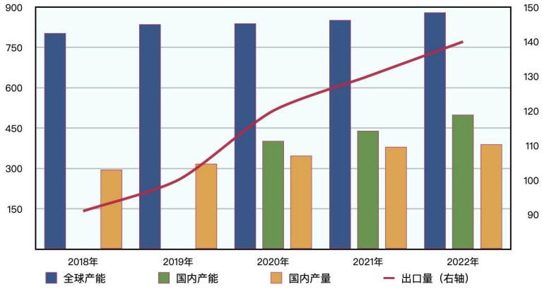 2018-2022年全球白粉產能及國內白粉產能、產量和出口量(萬噸)