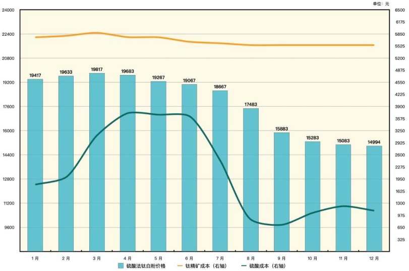 2022年,鈦礦價格保持在高位,鈦白粉市場高開低走。金紅石型鈦白粉市場受主要原材料(鈦精礦、硫酸)價格波動較大、新增產能逐步釋放、部分下游行業需求疲軟等因素的影響,呈現“整體供需偏弱,價格階段下滑”的業態。