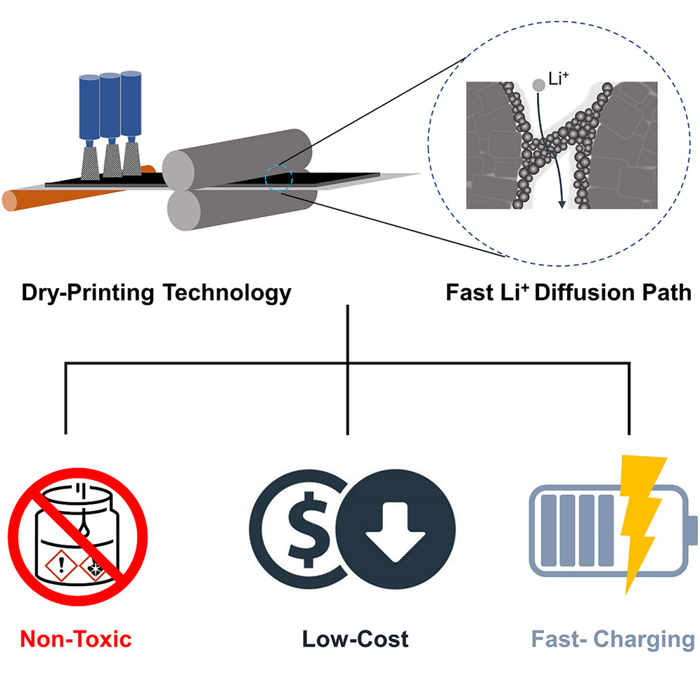 中國粉體網訊 隨著儲能需求的快速增長,鋰離子電池市場不斷擴大。傳統方法制備鋰離子電池電極時,通常將活性材料、導電添加劑、聚合物和有機溶劑混合制成漿料,采用濕法涂布工藝完成。其中涉及有毒的有機溶劑和耗能的干燥/回收過程。溶劑的蒸發導致材料分布不均勻,電極的微觀結構可能阻礙快速充電能力。