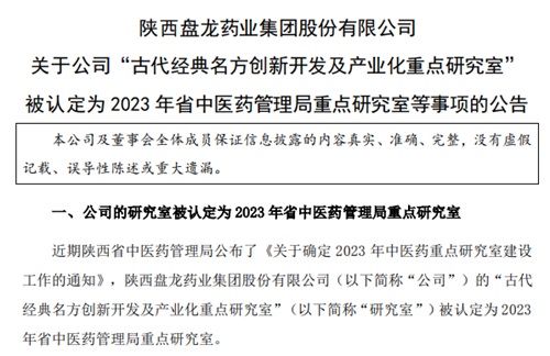 中國粉體網訊 近期,陜西省中醫藥管理局公布了《關于確定2023年中醫藥重點研究室建設工作的通知》,陜西盤龍藥業集團股份有限公司(“公司”)的“古代經典名方創新開發及產業化重點研究室”(“研究室”)被認定為2023年省中醫藥管理局重點研究室。