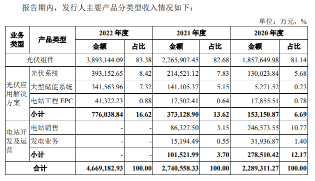 據招股書介紹,阿特斯2020-2022年的營業收入分別為232.79億元、280.10億元和198.19億元,其中2020年和2021年分別同比增長7.38%和20.32%。從產品構成來看,2020-2022年阿特斯光伏組件的收入分別為185.76億元、226.59億元和156.22億元,分別占當期主營業務收入的81.14%、82.68%和80.30%,報告期內公司銷量分別為10652MW、12745MW和7753.70MW。