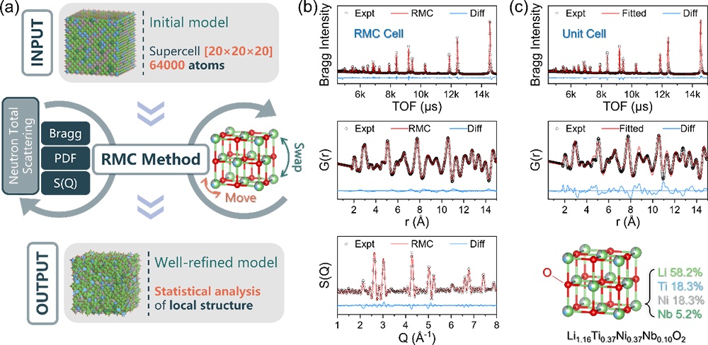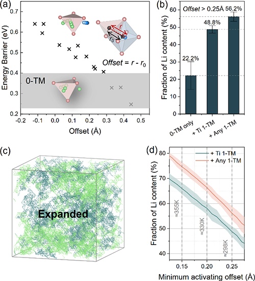 近日,中國科學院物理研究所研究人員與美國橡樹嶺國家實驗室研究人員合作,利用中子全散射(Neutron Total Scattering)實驗技術并結合逆蒙特卡洛(Reverse Monte-Carlo, RMC)數據分析方法研究了無序巖鹽模型正極材料Li1.16Ti0.37Ni0.37Nb0.1O2,還原構建了包含64000個原子位點的大尺度結構模型。此前研究發現,結構中Ni2+發生偏聚使得過渡金屬陽離子和鋰離子分布明顯偏離理論模型中陽離子隨機分布的情形。實驗觀察到的可傳導鋰離子的四面體空位數目(理論模型中預測的四面體空位周圍只含有鋰離子,不含有過渡金屬陽離子,0-TM)顯著低于理論模型預測的含量。進一步對超胞結構進行統計分析發現,過渡金屬Ti4+離子在晶格中存在偏離TM-O八面體中心位點分布的現象。第一性原理計算結果表明,該偏移引起的晶格畸變顯著影響鋰離子遷移能壘,使得一部分原本不具有活性的鋰擴散通道(四面體空位周圍含有1個過渡金屬陽離子,1-TM)被激活。將此修正因素引入鋰離子滲流模型后發現,這部分額外的鋰離子擴散通道使得整體參與滲流的鋰離子含量顯著上升,結構分析中觀測到的可傳導鋰離子的含量與電化學測試中材料實際的可用容量基本符合。