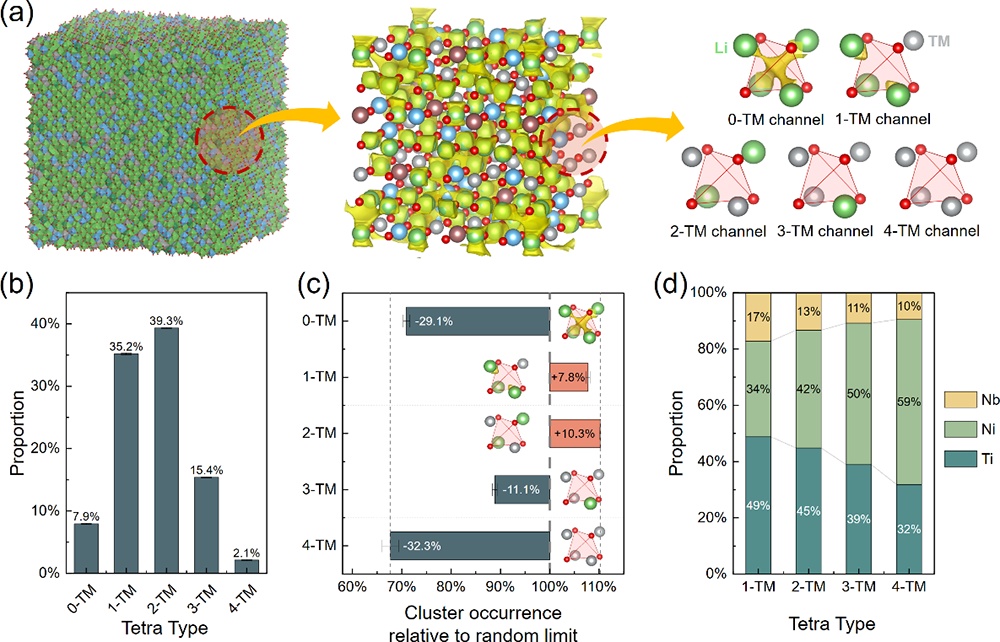 理論研究表明,無序氧化物結構中鋰離子在TM-O八面體平衡位點之間通過特定的四面體空隙位點(稱之為四面體通道)遷移,四面體空隙周圍過渡金屬陽離子和鋰離子的排布方式顯著影響鋰離子傳導。然而實際材料中,由于過渡金屬陽離子離子半徑和電荷數的差異以及材料合成工藝的影響,陽離子并非完全隨機分布形成完美的無序巖鹽結構。陽離子偏聚形成的短程結構影響可傳導鋰離子四面體通道的幾何構型、分布和連通性,從而顯著影響無序氧化物正極材料中鋰離子存儲和傳導特性。由于材料結構復雜性增加,傳統的實驗分析方法難以精準確定陽離子無序氧化物材料的結構,陽離子無序氧化物材料結構中鋰離子傳導機制的理論預測也有待進一步證實。