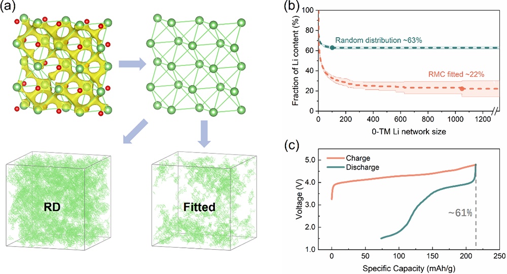 圖3 無序超胞結構中鋰滲流網絡的計算、可視化以及與電化學實驗結果的對比