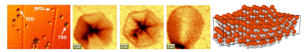 圖片 SiC襯底中穿透型螺位錯(TSD)、穿透型刃位錯(TED)及基平面位錯(BPD)的形貌圖