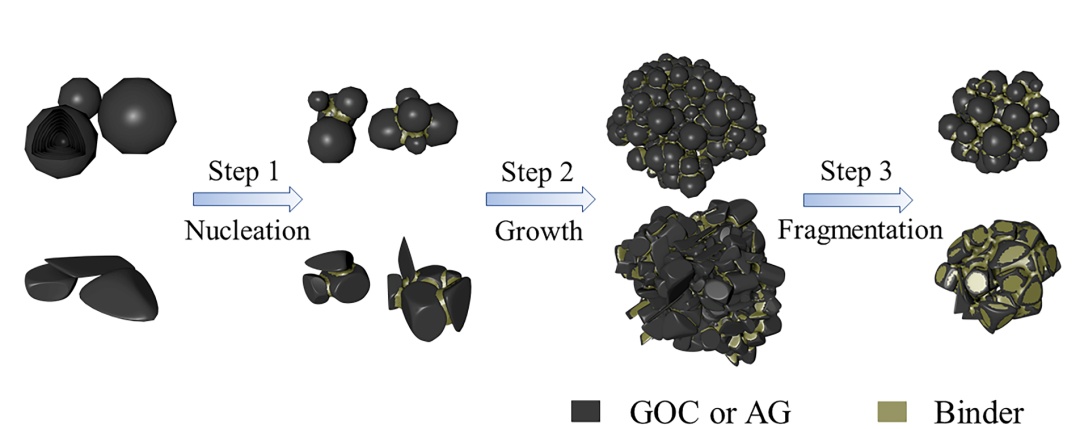 針對這一問題,北京化工大學宋懷河教授課題組在《新型炭材料》(New Carbon Materials,2022,37(2),402-411)上發表研究論文“A wet granulation method to prepare graphite particles with a high tap density for high volumetric energy density lithium-ion storage”。該文報道了一種通過濕法制粒制備高振實密度石墨顆粒的簡單方法。通過高剪切濕法制粒技術將石墨化洋蔥碳(GOC)和人造超細石墨(AG)致密成球型大顆粒(WG-GOC、WG-AG),見圖1。所制備石墨顆粒具有較高的球型度和致密度,能有效地提高材料振實密度,并獲得了高體積比容量。