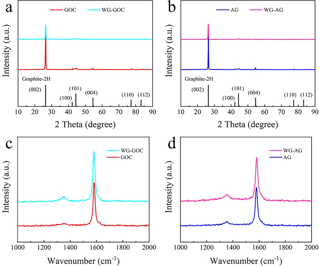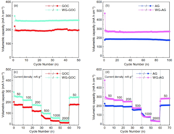 電化學結果表明(圖3),在50mAg-1的電流密度下,造粒后的WG-GOC和WG-AG相比于各自的石墨原料,體積比容量分別增加了35%和55%。更讓人驚訝的結果是,在1000mAg-1和2000mAg-1的大電流密度下,相比GOC,WG-GOC的體積比容量分別提升了94.4%和165.7%。此外,得益于高剪切濕造粒加工時間短、造粒效率高等優點,該研究提供了一種制備高振實密度石墨負極的簡便方法,具有良好的工業化前景。