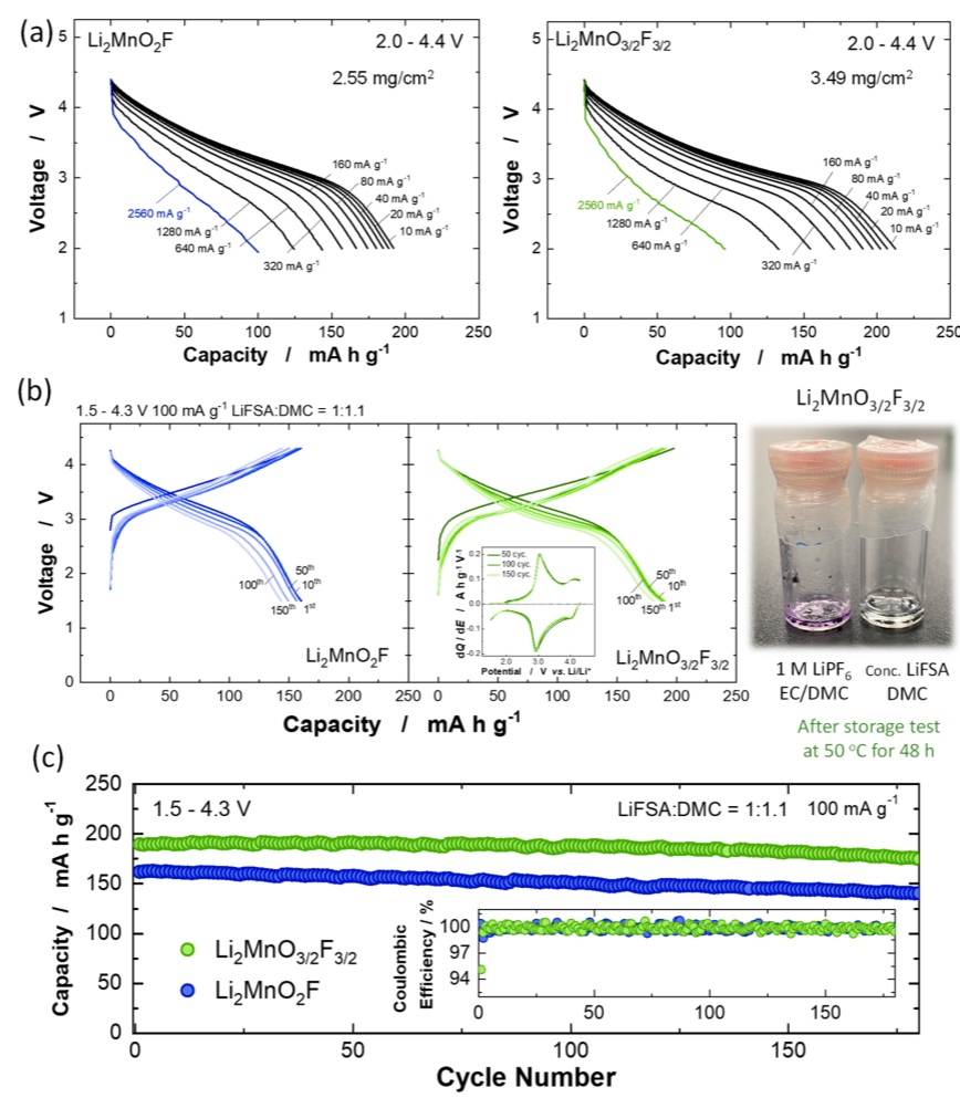 【圖5】(a) Li2MnO2F和Li2MnO1.5F1.5的速率能力比較。在100 mA h g-1的速率和4.3 V截止電壓下,使用濃縮電解液測試Li2MnO2F和Li2MnO1.5F1.5的電極可逆性。(b)充放電曲線和不同電解液儲存后的樣品圖片。(c) 容量保留率和庫倫效率。在常規電解液中,使用4.3 V截止電壓得到的電化學數據在支持信息的圖S5c和S5d中。