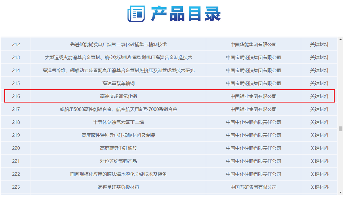 中國粉體網(wǎng)訊 為加快中央企業(yè)科技創(chuàng)新成果應(yīng)用推廣,促進(jìn)科技成果向現(xiàn)實(shí)生產(chǎn)力轉(zhuǎn)化,國資委科創(chuàng)局組織開展科技創(chuàng)新成果征集遴選工作。經(jīng)企業(yè)報送與專家評審,編制了《中央企業(yè)科技創(chuàng)新成果推薦目錄(2022年版)》。近日,該目錄也是進(jìn)行了發(fā)布,目錄包括核心電子元器件、關(guān)鍵零部件、分析測試儀器、基礎(chǔ)軟件、關(guān)鍵材料、先進(jìn)工藝、高端裝備等7個領(lǐng)域369項(xiàng)技術(shù)產(chǎn)品,其中中國鋁業(yè)集團(tuán)有限公司所屬中鋁新材料有限公司自主研發(fā)生產(chǎn)的高純度超細(xì)氮化鋁(AlN)粉體成功入選。
