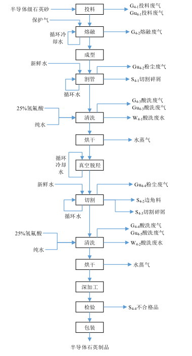 割管:將石英管、石英管棒經(jīng)用切割機(jī)、打磨機(jī)等設(shè)備加工成要求的規(guī)格尺寸,加工設(shè)備用水沖洗冷卻抑塵,切割過程中會產(chǎn)生極少量粉塵、切割碎屑。