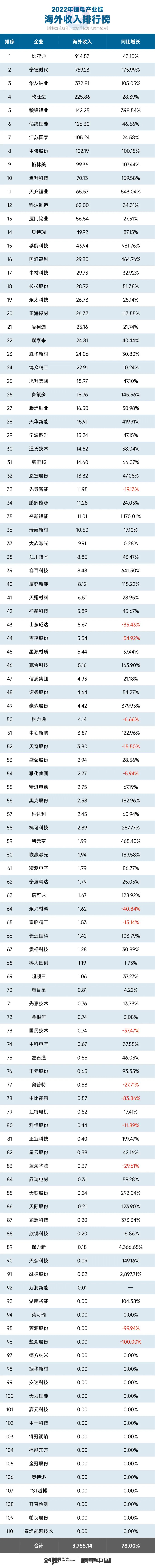 此外,據24潮統計,其中前20名企業2022年海外收入合計為3347.17億元,占比高達89.14%。其中8家企業海外收入規模突破100億元大關,比亞迪、寧德時代與華友鈷業高居榜單前三名;前20名企業2022年海外收入全部實現20%以上速度增長,其中海外收入增長最快的三家企業依次為:貝特瑞-同比增長981.76%,當升科技-同比增長543.04%,孚能科技-同比增長464.76%。