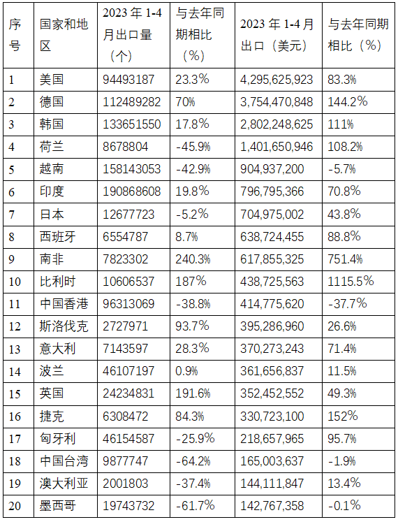 2023年1-4月鋰離子電池出口前二十大目的地變化情況