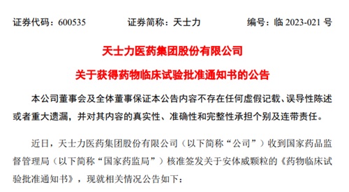 中國粉體網訊 近日,天士力醫藥集團股份有限公司(“公司”)收到國家藥品監督管理局(“國家藥監局”)核準簽發關于安體威顆粒的《藥物臨床試驗批準通知書》。后續公司將按照批準通知書的要求開展本品的Ⅲ期臨床試驗研究相關工作。