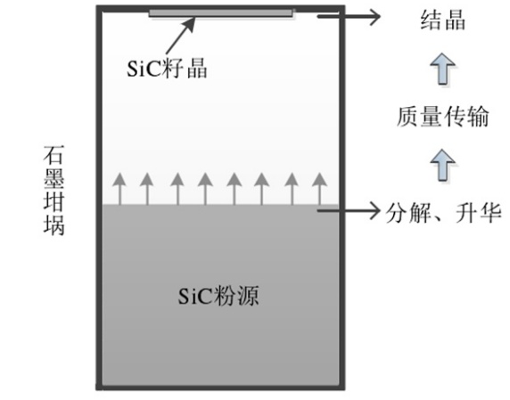 目前生長SiC單晶的方法主要有物理氣相傳輸法(PVT法)、高溫化學氣相沉積法、液相法等。其中物理氣相傳輸法是發展最成熟的,其具體生長過程為處于高溫處的SiC原料升華分解成氣相物質(主要組分為Si,Si2C,SiC2),這些氣相物質輸運到溫度較低的籽晶處,結晶生成SiC單晶。目前,商品化SiC單晶都是采用PVT法生長的。