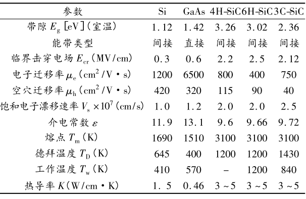 相比于第一代和第二代半導體材料,SiC半導體具有一系列優良的物理化學特性,除了禁帶寬度,還具有高擊穿電場、高飽和電子速度、高熱導率、高電子密度和高遷移率等特點。其臨界擊穿電場是Si的10倍,GaAs的5倍,這提高了SiC基器件的耐壓容量、工作頻率和電流密度,降低了器件的導通損耗。加上比Cu還高的熱導率,器件使用時無需額外散熱裝置,減小了整機體積。