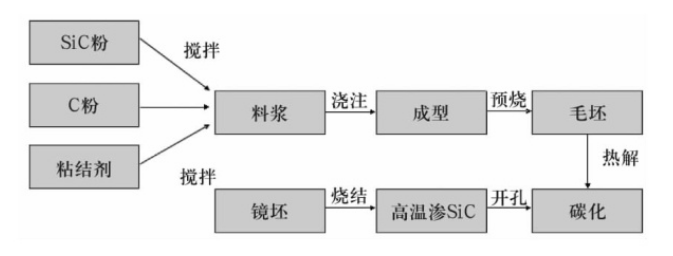 反應燒結碳化硅工藝過程是將碳源和碳化硅粉混合,通過注漿成型、干壓或冷等靜壓成型制備出坯體,然后進行滲硅反應,即在真空或惰性氣氛下將坯體加熱至1500℃以上,固態硅熔融成液態硅,通過毛細管作用滲入含氣孔的坯體。液態硅或硅蒸氣與坯體中C之間發生化學反應,原位生成的β-SiC與坯體中原有SiC顆粒結合,形成反應燒結碳化硅陶瓷材料。
