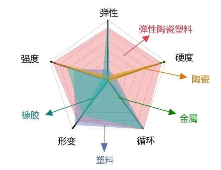 “彈性陶瓷塑料”與其他材料的五項性能對比