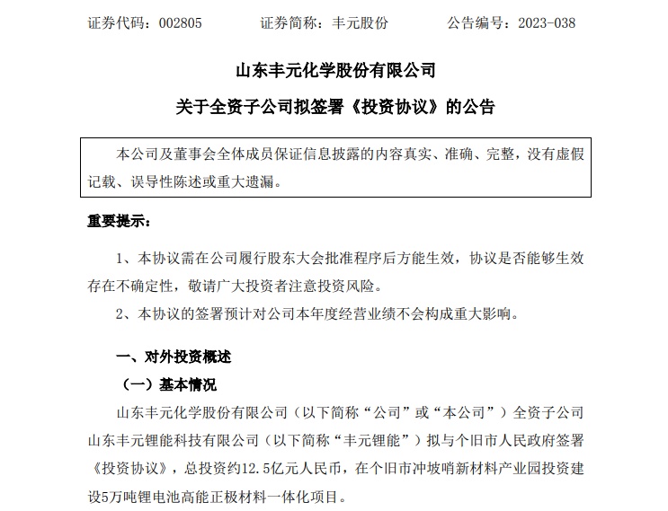 中國粉體網訊 6月9日,豐元股份發布公告,全資子公司豐元鋰能擬與個舊市人民政府簽署《投資協議》,總投資約12.5億元,在個舊市沖坡哨新材料產業園投資建設5萬噸鋰電池高能正極材料一體化項目。