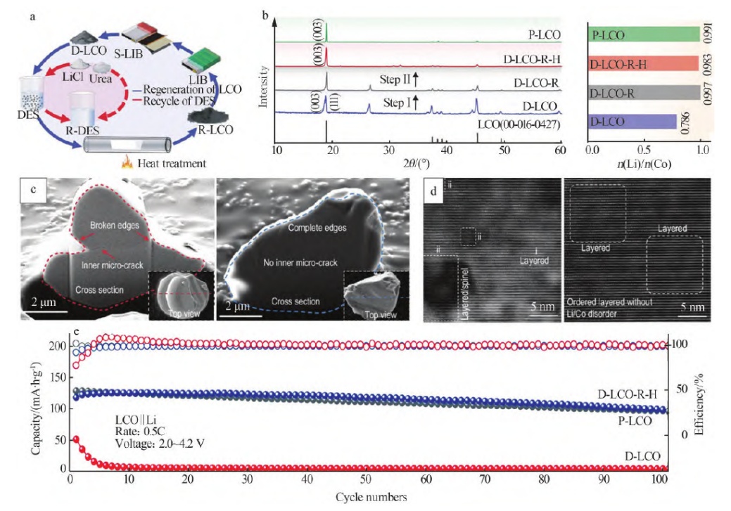 (a)DES直接回收過程示意圖;(b)LCO正極XRD譜圖;(c)失效和修復后LCO正極FIB-SEM圖;(d)失效和修復后LCO正極TEM照片;(e)不同LCO在0.5C下的循環(huán)性能圖(來源:WANG Junxiong,et al,《Direct and green repairing of degraded LiCoO2 for reuse in lithium-ion batteries)
