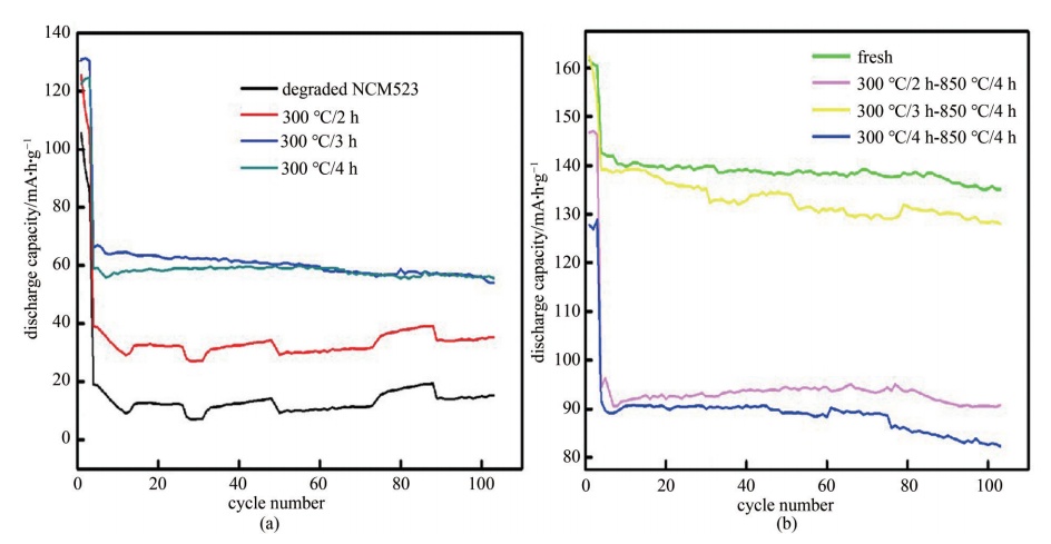 樓平等在空氣氣氛中,采用低共晶熔鹽混合物LiNO3-LiOH為鋰鹽進行補鋰修復再生,從而將廢舊NCM523重新修復成初始充電比容量的材料。其電化學結(jié)果如下圖所示,在0.1C的充放電電流密度和2.8~4.25V 的電壓范圍內(nèi),300℃/3h~850℃/4h修復再生后的NCM523首次放電比容量為161.2mAh/g,充放電庫侖效率為87.8%,1C條件下循環(huán)100次后,放電比容量為132.6mAh/g,相較于未處理的廢棄三元正極材料,倍率性能和循環(huán)性能得到了大幅提升,與商業(yè) NCM523材料相差無幾。