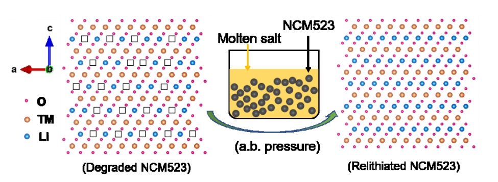 NCM523正極再鋰化過程(來源:SHI Y,et al,《Ambient-pressurere lithiation of degraded LixNi0.5Co0.2Mn0.3O2(0<x<1)via eutectic solutions for direct regeneration of lithium-ion battery cathodes》)