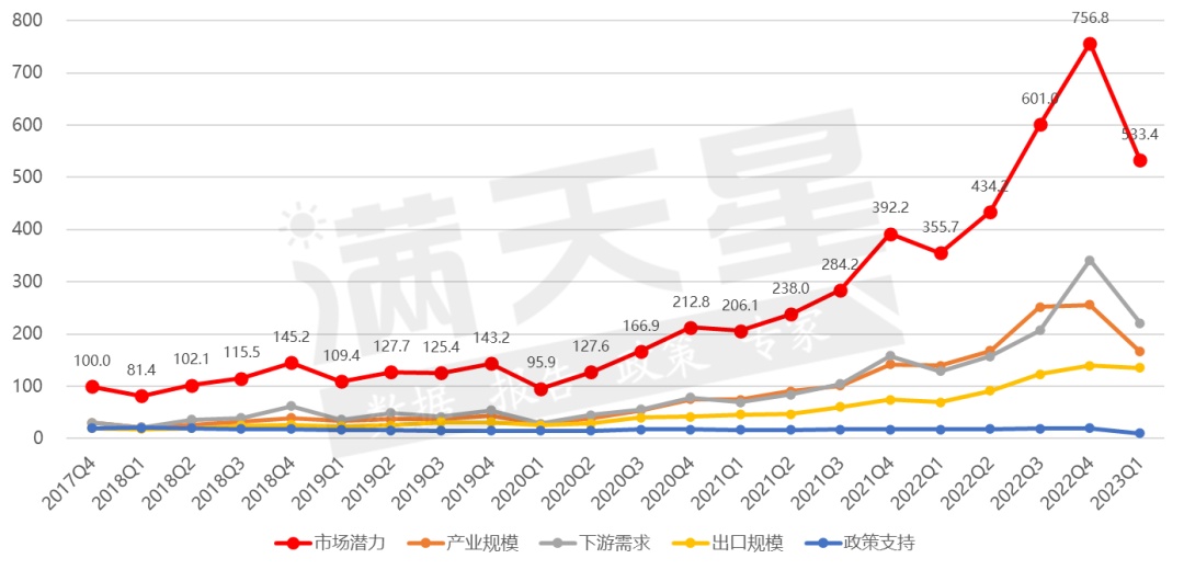 圖3 2017Q4-2023Q1中國鋰電產業發展指數市場潛力維度指標值