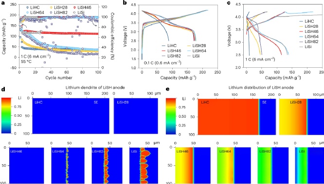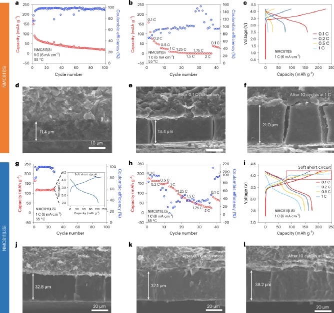 圖1|Si負極和Li-Si合金負極的電化學性能以及切面SEM圖